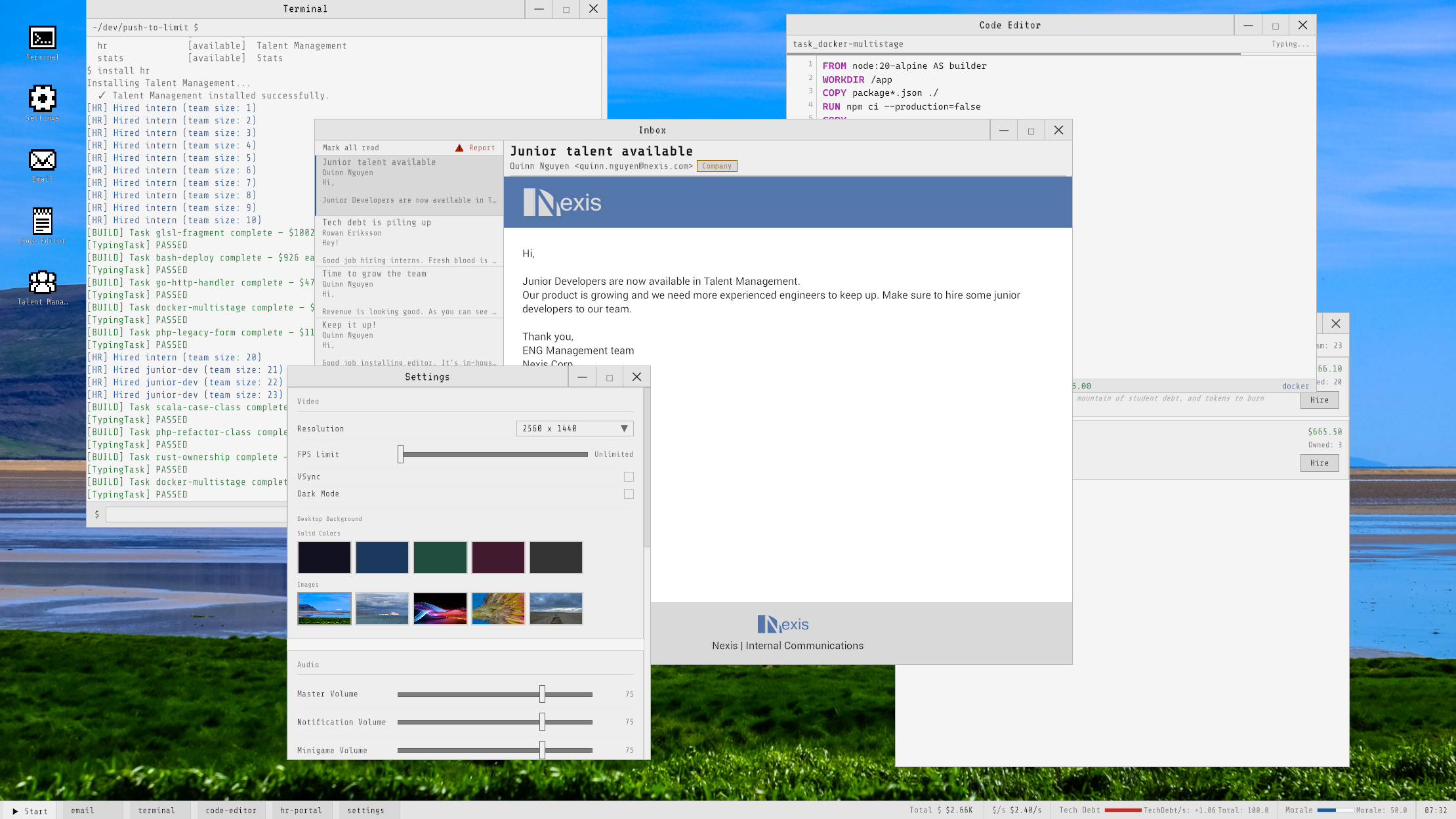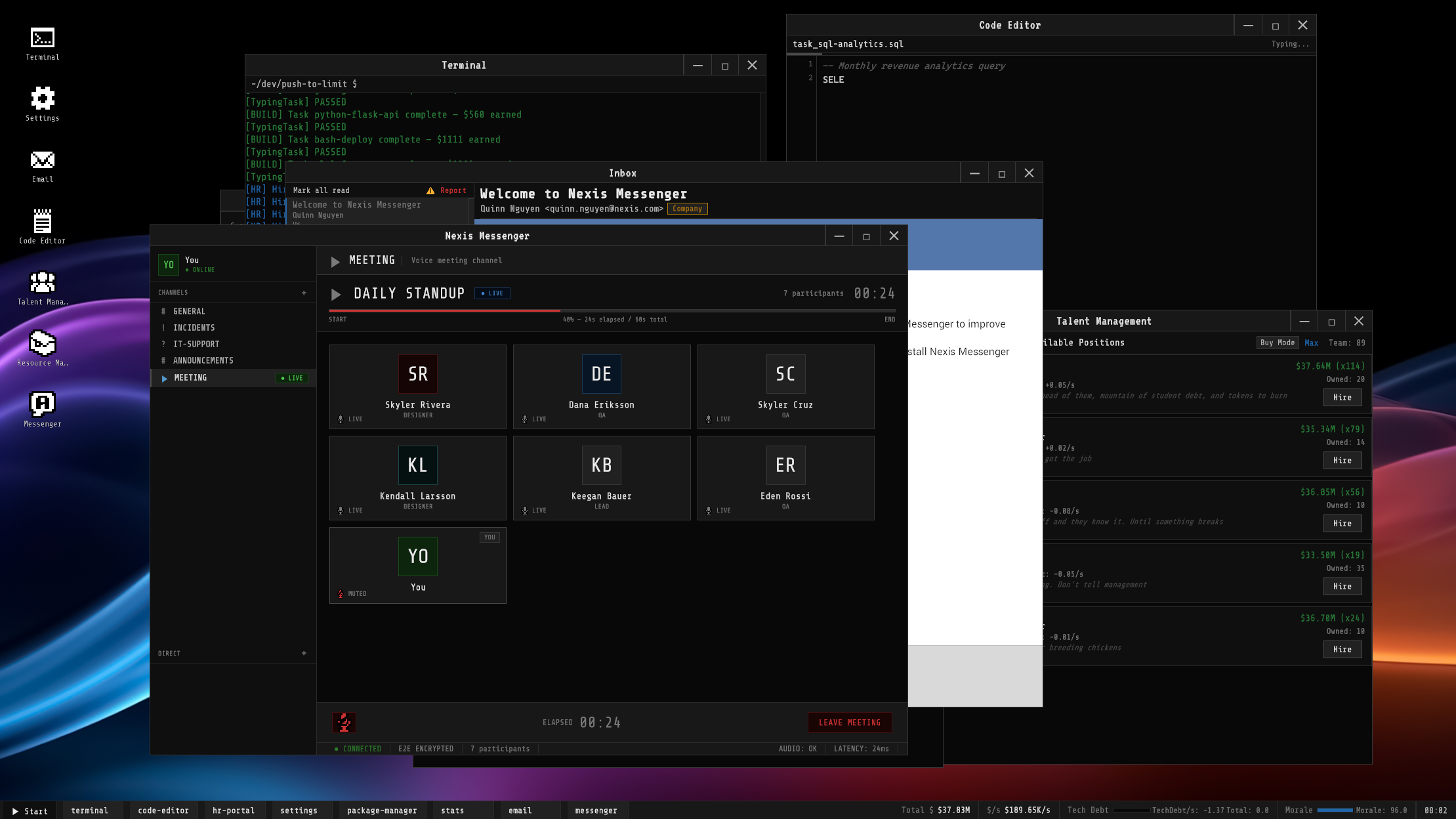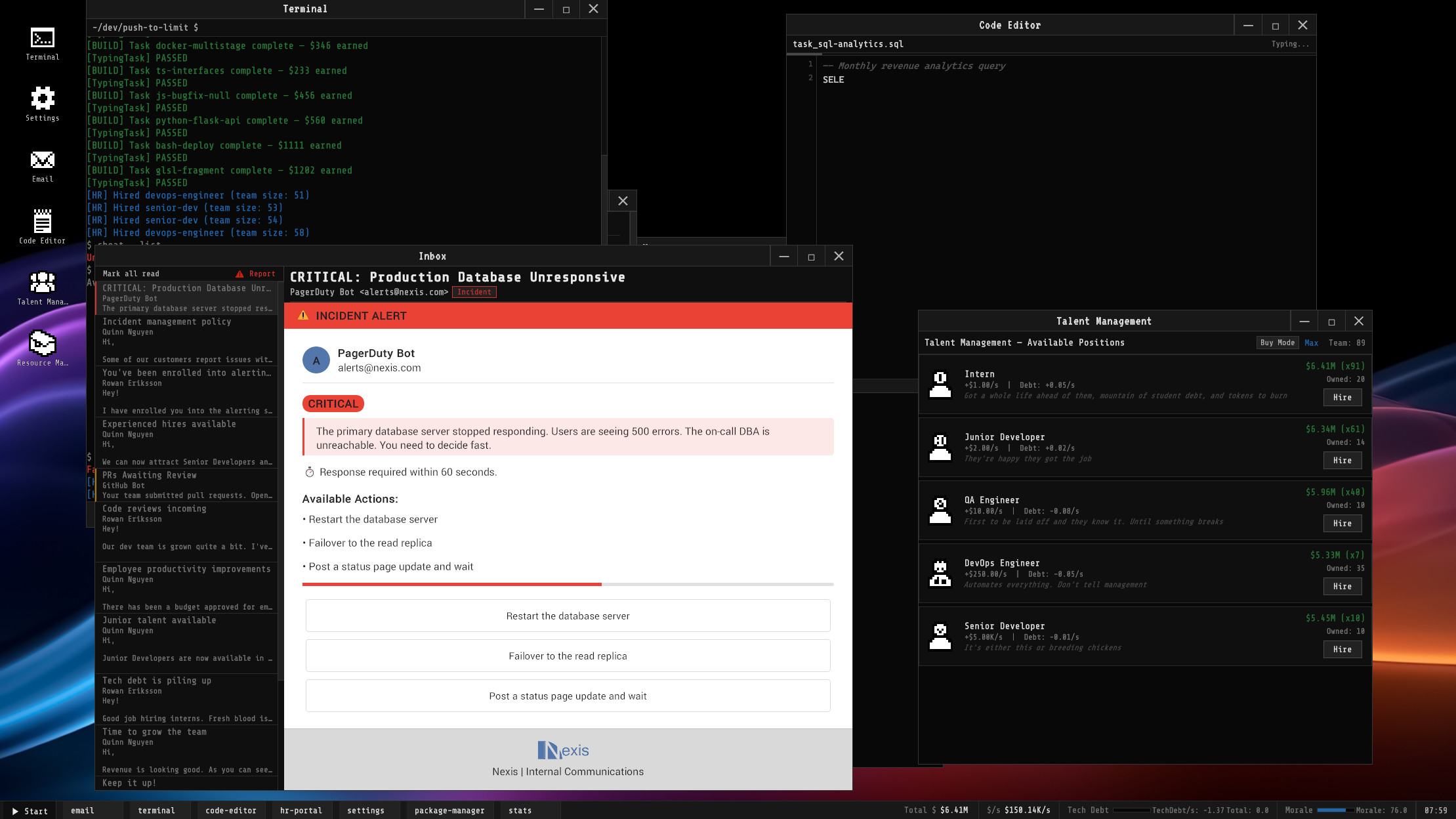 push --to-limit is an incremental game where your job is to write code, hire more people, solve incidents, and attend meetings. At first you simply push buttons to write code - eventually you automate your job by hiring other developers, while keeping an eye on tech debt and team morale.